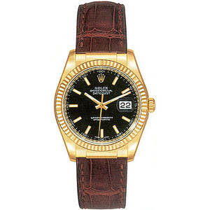 Rolex Datejust Black Index Dial Fluted Bezel 18k Yellow Gold Leather Strap Watch,